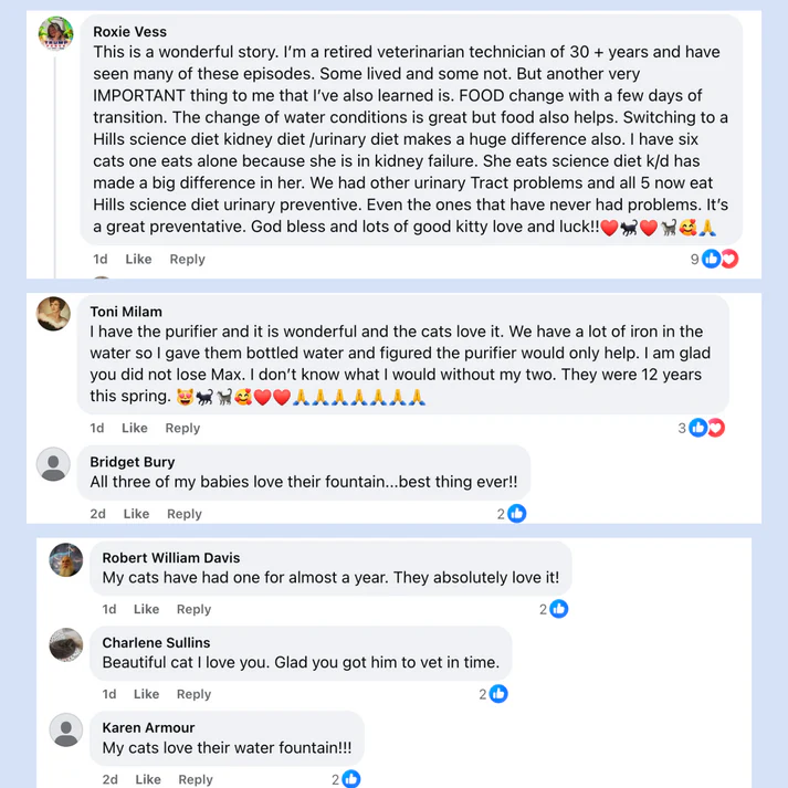 The VitalSip Water Fountain uses your cat's natural instincts to triple their daily water intake, preventing kidney disease, urinary problems, and costly vet bills while giving you complete peace of mind about their health.